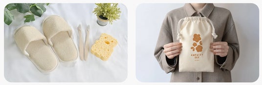 SUS amenityでは、今回新発売するこども用アメニティの他にも、巾着セット・ポーチセットを展開しており、いずれも環境に優しい竹素材の歯ブラシやカミソリ、コームを採用しています。サステナブルなアメニティへの切り替えはホテル・旅館業界のブランディングにつながると好評で、そのデザイン性の高さから、販売用として導入いただくことも多いです。