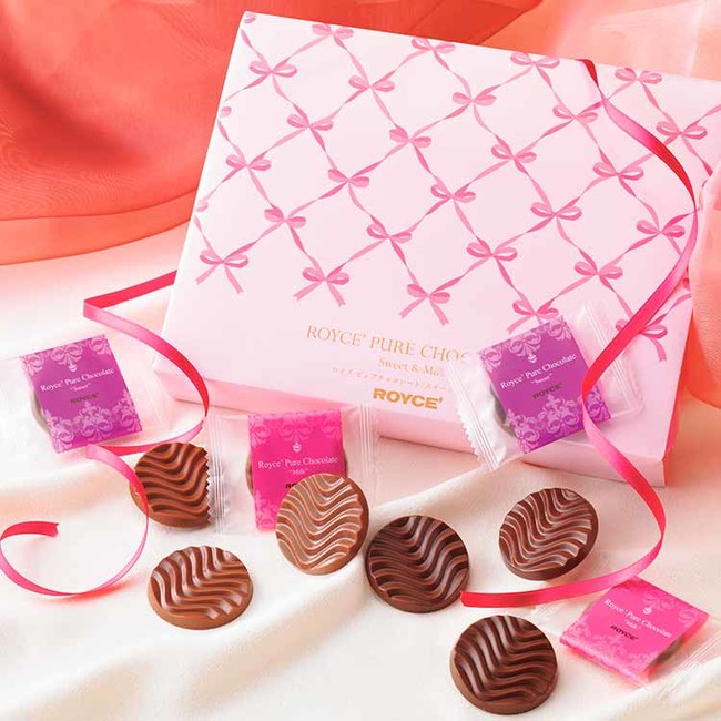 酸味と苦味が調和したすっきりとした味わいの[スイート]と、カカオとミルクの味わいを生かしバランスよくまろやかに仕上げた[ミルク]の組み合わせ。ピュアチョコレートの人気の味をピンクのリボンのデザインをあしらったエレガントな包装紙で包みました。