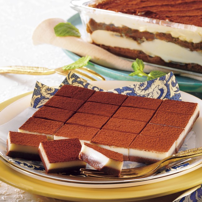 イタリアで生まれたデザート「ティラミス」をイメージした生チョコレート。マスカルポーネチーズのパウダーを入れたホワイトチョコレートのガナッシュと、コーヒーとコーヒーリキュール入りのガナッシュを2層に重ね、ココアパウダーをかけました。