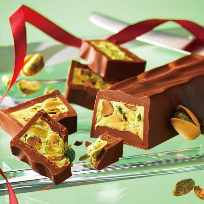 香ばしくコク豊かなピスタチオクリームに、深煎りしたピスタチオと塩がけしたピスタチオの2種類を混ぜ込んで、口どけの良いミルクチョコレートにとじ込めました。切り分けると、なめらかなピスタチオクリームとたっぷり入ったピスタチオが表情豊かに顔をのぞかせます。ピスタチオの香ばしく旨味あふれる魅力を引き出した、ピスタチオづくしの味わいを存分にお楽しみください。好きな厚さに切り分けて食べるスタイルが楽しいチョコレートです。