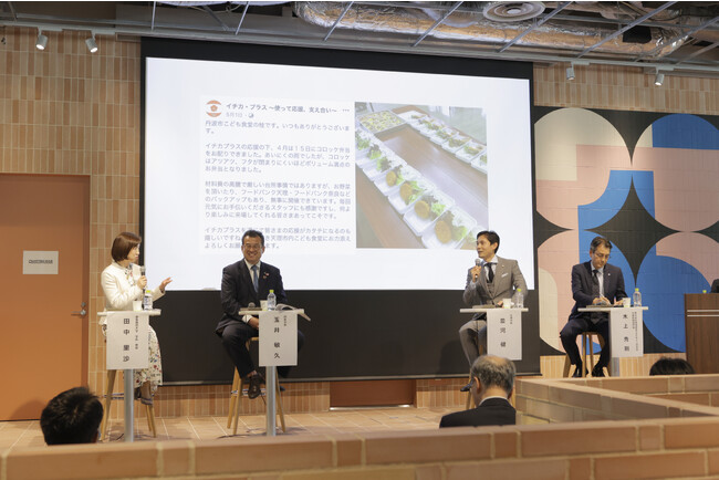 並河市長は“支え合い”を天理市のすべての地域に広げていくために2022年度より開始した地域通貨「イチカ」の仕組みを紹介。消費された「イチカ」の一部をこども食堂などの支援にあてることで、共感、応援、支え合いの活動に還元されていく循環を生み出し、地元消費に新たな価値を創出しています。「大事なのは市民の実感」と述べ、実践からの気づきを共有しました。