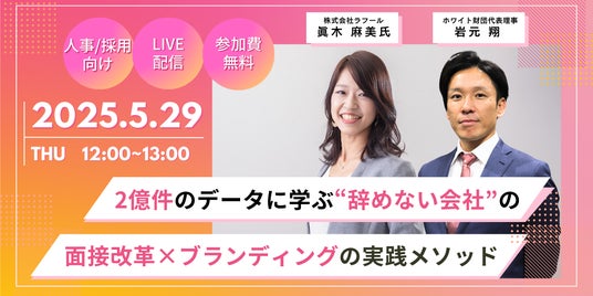 ホワイト企業認定を展開する一般財団法人 日本次世代企業普及機構(本部:大阪市北区、代表理事:岩元翔)は、2025年5月29日(金)に無料オンラインセミナー「2億件のデータに学ぶ“辞めない会社”の面接改革×ブランディングの実践メソッド 」を開催いたします。