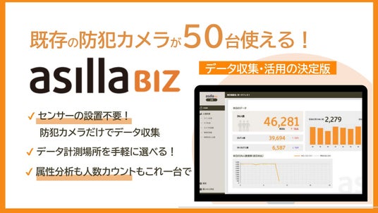 「asilla BIZ」は、既存の防犯カメラ映像を活用し、AIによる映像解析で人流データを収集・分析する人流解析プラットフォームです。人数カウント、領域内・カメラ内の混雑度計測、曜日・時間帯別の混雑傾向等の分析が可能で今後も各種アプリケーションを拡張予定です。これらにより施設の人の流れを「見える化」し、効率的な施設運営や顧客体験向上に貢献します。