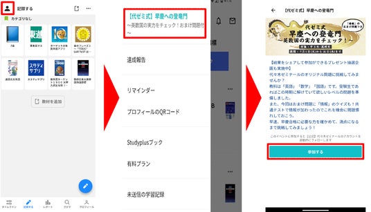 1. 「Studyplus」を開き、左上にある自分のアイコンをタップしてメニューを開く