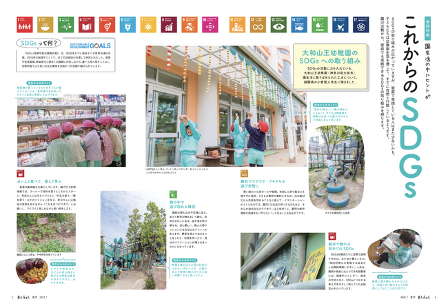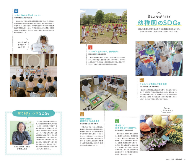 幼稚園配布の「あんふぁん」7月号(2023年6月9日発行)では、5つの幼稚園のSDGsの実例を特集。園生活への取り入れ方や子どもたちを自然にうながすコツを、先生のコメントとともに紹介しています。
