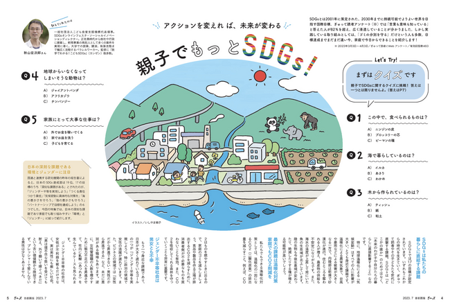 保育園配布の「ぎゅって」7月号(2023年6月13日発行)では、「親子でもっとSDGs」をテーマに、SDGsを身近にとらえるクイズや、家庭でできる具体的なアクションを紹介しています。