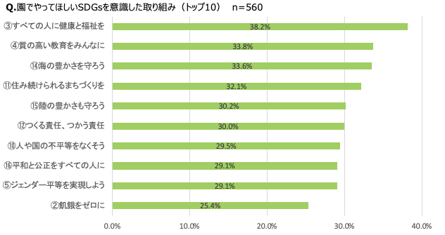 また、「SDGs17の目標」について、園でやってほしいことを聞いたところ、「3.すべての人に健康と福祉を」が約4割で1位。2位以下はいずれも3割前後で差がなく、教育や自然の豊かさなど、ジャンルは多岐に渡ります。園にさまざまなことを体験させてほしいという気持ちが表れているようです。一方、下位3つは「働きがいも経済成長も」「パートナーシップで目標を達成しよう」「産業と技術革新の基盤を作ろう」でいずれも1割以下でした。