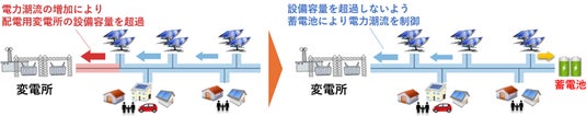 太陽光発電等の再生可能エネルギーの普及拡大に伴う発電電力(電力潮流)の増加により、配電用変電所の設備容量不足や、電圧上昇による適正電圧の逸脱が発生し、停電の可能性やお客さまの電気機器の動作異常が発生する可能性が高まっています(図1)。