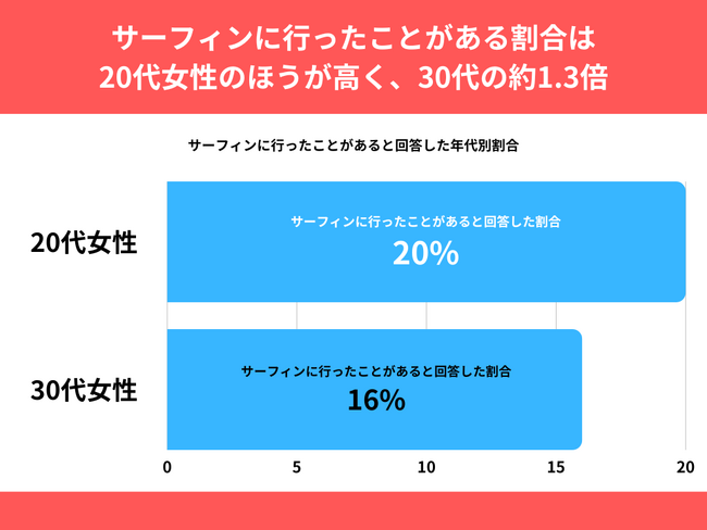 サーフィンに行ったことがあると回答した割合を年代別でみてみますと、20代が20%、30代が16%という結果になりました。