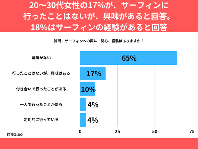 20~30代女性を対象とした「サーフィンへの興味・関心、経験はありますか?」というアンケートで最も多かった回答は「興味がない」で65%でした。