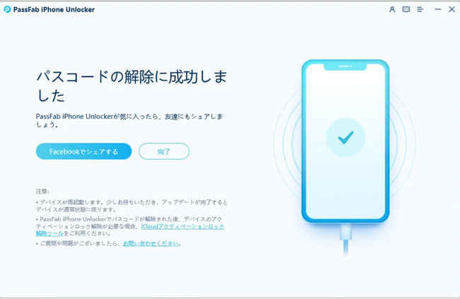 Step4:ダウンロードが完了したら、「解除開始」ボタンをクリックしてパスワードの削除が始まります。成功するまで数秒かかります。その後、パスワードなしのデバイスを開き、新しいパスワードまたはTouch IDを設定できます。