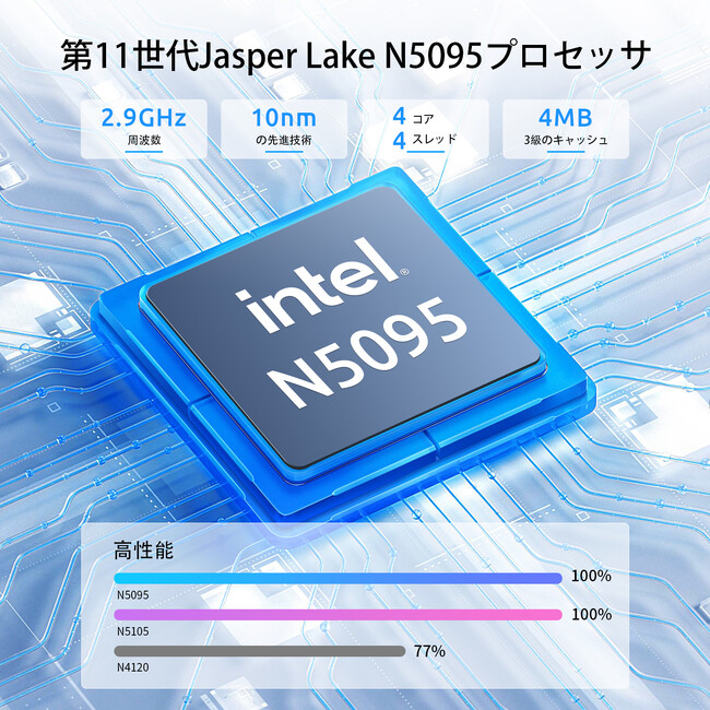 B3 は Intel の第 11 世代 Jasper Lake N 5095 プロセッサ(2.0GHz~2.9GHz)を使用します。新しいTremontアーキテクチャーに基づいて、4コア4スレッド、4MB3級のキャッシュ、10nmの先進技術、パルス周波数2.90 GHz、性能が前世代プロセッサーより35%高い、メモリ速度が2933 MHzで、最大メモリ。第11世代のN5095では、より安定した画質が得られます。4K再生も問題なし。PS、ビデオクリップ、YouTubeなどをスムーズに実行できます。
