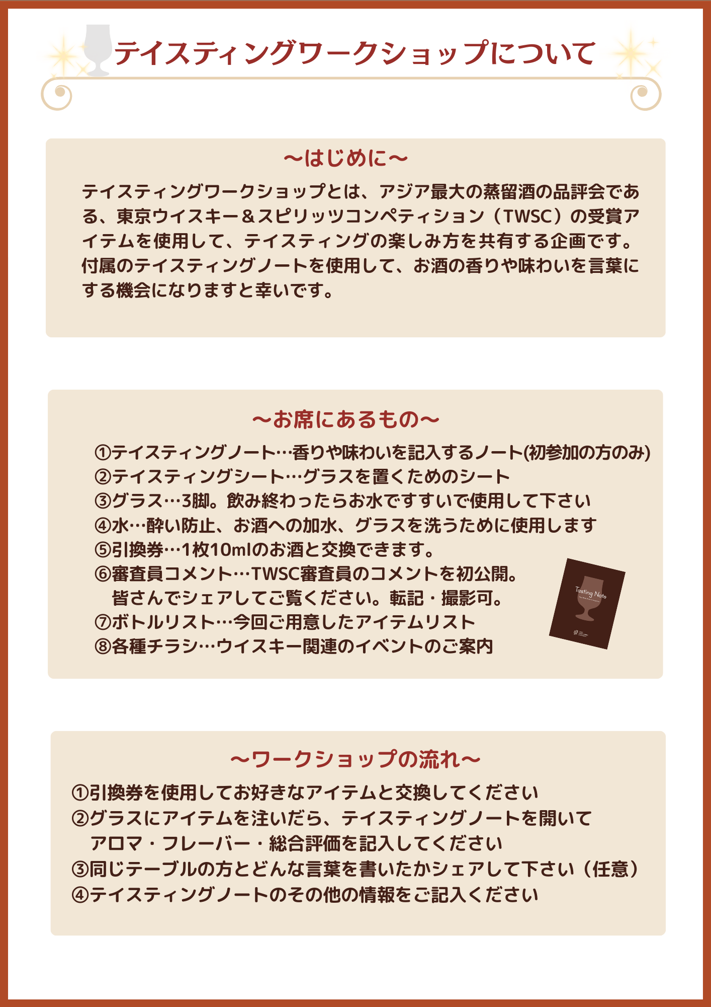 持ち物:ペンまたは鉛筆/テイスティングノート(2回目参加者のみ)
