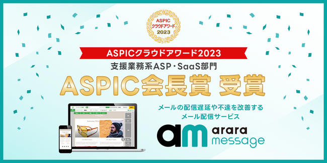 アララ株式会社(本社:東京都港区、代表取締役社長:尾上 徹、証券コード:4015、以下 アララ)が提供するメール配信サービス「アララ メッセージ」が、総務省後援「ASPICクラウドアワード2023」の支援業務系ASP・SaaS部門において「ASPIC会長賞」を受賞したことをお知らせいたします。