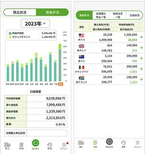 資産の推移はグラフで表示、通貨ごとの運用状況もひと目で把握ができます。