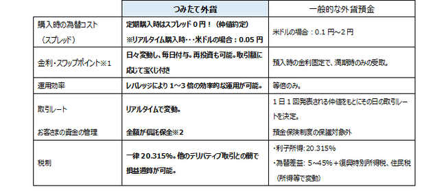 「ジャンボ宝くじ付きつみたて外貨」は外国為替証拠金取引の仕組みを利用した積立サービスであり、外貨運用を用いた資産形成の新しい選択肢としてご提供しております。一般的な外貨預金と比較して運用効率を上げられることなどから、これまで外貨預金をされていた方からも注目いただいております。