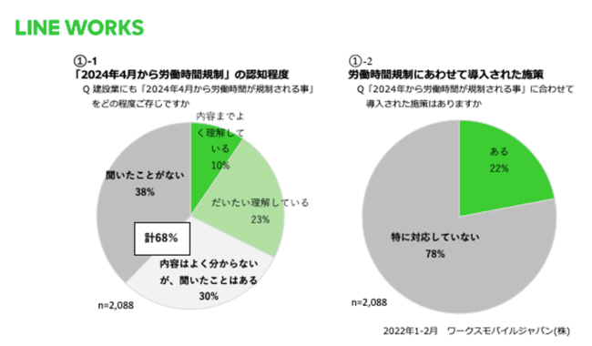 建設業の特に現場で働く方の労働時間や日数は、他産業に比べて多いと言われています。そんな中、2024年4月から労働時間の規制が本格的に始まり、違反した場合に罰則が科される場合がありますが、現場で働く方はご存じない方も多いようです。施工管理者の現場実態の調査結果からもわかるとおり、現場で写真をとって事務所に帰ってから整理したり、図面や報告書を紙で印刷したり、これらをデジタルに置き換える事により残業時間の削減が期待できます。また、協力会社との調整・情報共有に時間がかかるということですが、電話での言った言わないや曖昧な指示によって、作業の出戻りが発生するという経験をした方も多くいるのではないでしょうか。これらの課題に対して、ビジネスコミュニケーションツール「LINE WORKS」を導入し、残業時間を削減できたという建設業の方が多くいらっしゃいますので、是非弊社の導入事例などをご覧頂ければと思います。
