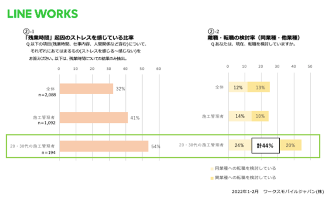 2 20-30代の施工管理者の約半分(54%)以上が「残業時間」起因のストレスを感じており、また、約4割(44%)が離職・退職を検討。