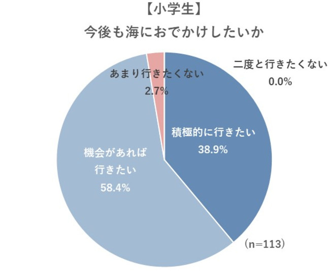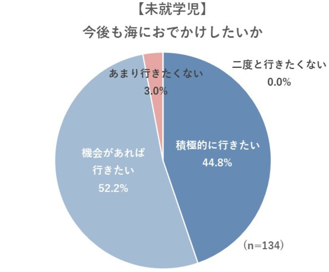 すると、未就学児・小学生ともに「積極的に行きたい」「機会があれば行きたい」を選んだ親子がほとんど。前述のように「トイレが汚くて困った」「授乳室やおむつ替えシートがなくて困った」といった衛生面で困った経験があったとしても、変わらず今後も「家族で海に行きたい」と考えている親子が大半のようです。