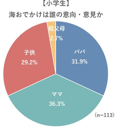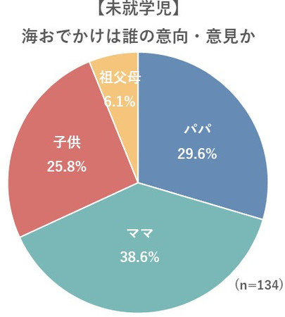 未就学児・小学生による差はほとんどなく、若干ママの意向が強いものの、概ね「パパ」「ママ」「子供」が均等になりました。前述の通り、子供自身の興味がきっかけとなっているケースも多いため、パパやママだけでなく、子供に向けたアプローチが海への来訪に繋がる可能性もなかなか高そうです。