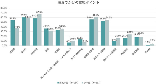 海を選ぶ際の重視ポイントは「混雑具合」「安全性」「駐車場の有無」「自宅からの距離」「清潔感」