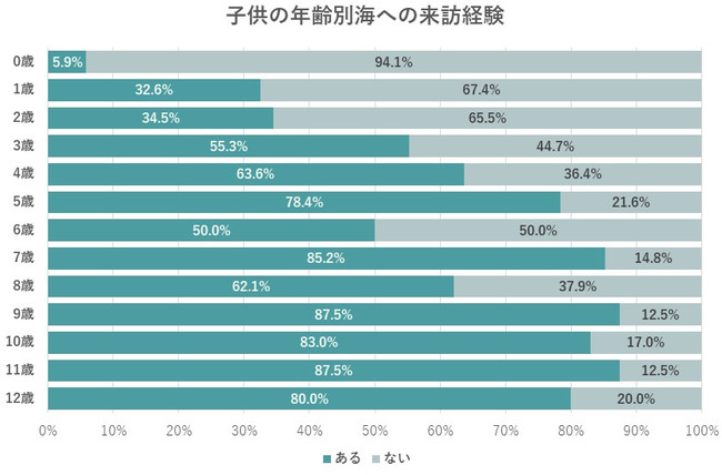 未就学児の場合、まだ子ども自身が十分に楽しめない事もあり、おでかけ経験のある親子は少なくなりますが、子供の年齢があがるにつれて海へおでかけする親子の比率は大きく増え、5歳を越えてくると、大半の家庭は家族で海にお出かけしているようです。