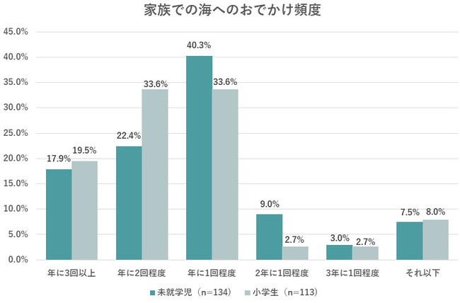 未就学児・小学生どちらも、大半が「年に1回以上」海へおでかけしていると回答。子どもの自然との接触が少なくなってきているなんて話も良く聞きますが、海については大半の家族が1年に一度は訪れており、頻度としてはそこまで低くない印象です。