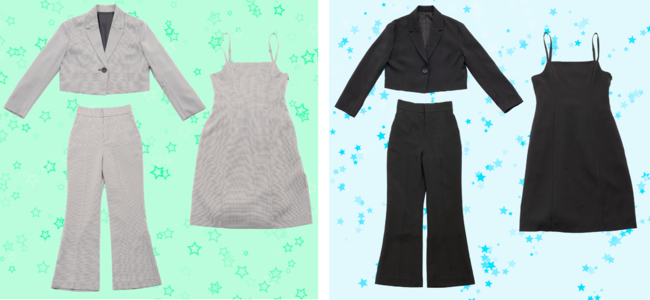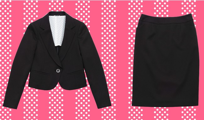 ベーシックな黒無地のセットアップは、きちんとした印象を演出しつつもジャケット丈を短くすることでトレンドを意識。タイトスカートとの合わせが、大人っぽくスーツを着こなしたい女子にオススメの1着です。アルバイトやインターンなどのかっちりした場面での着用も可能です。