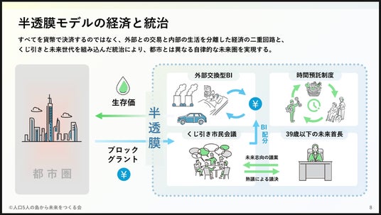 概要:都市と地方(1万人以下の町)の間に、細胞膜のような「半透膜」という緩やかな境界を設定するモデル。 地方を都市の経済競争に巻き込むのではなく、独自の「時間クレジット」を用いた互助経済圏として確立。「経済合理性がないから切り捨てる」のではなく、都市の持続可能性のために地方が必要であるというロジックを構築し、審査員から高く評価されました。