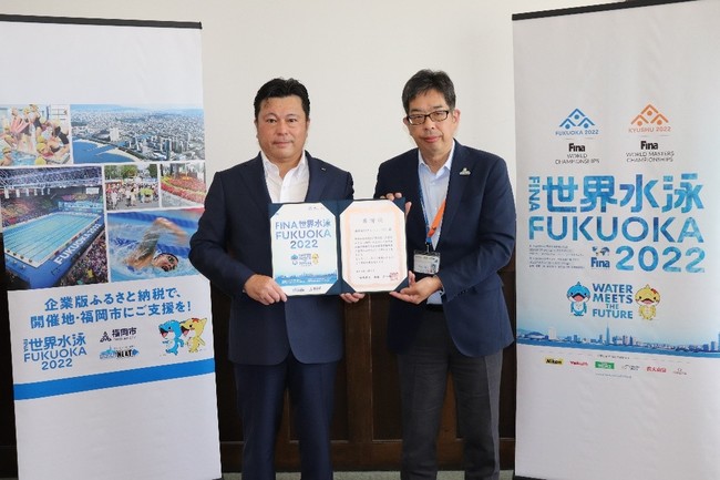 福岡市 市民局 局長 下川祥二様:この度は世界水泳選手権福岡大会を開催する福岡市にご寄附をいただき、感謝申し上げます。本大会は来年7月に再延期となりましたが、来年は海外からの参加者や観光客もお迎えし、非常に盛り上がる大会にしてまいりたいと考えております。