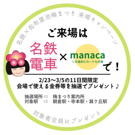 名鉄電車で佐布里池梅まつりに来場された方が参加できるキャンペーンで、参加者全員に抽選で梅まつり会場で使える金券等の景品が当たります。