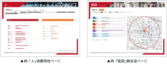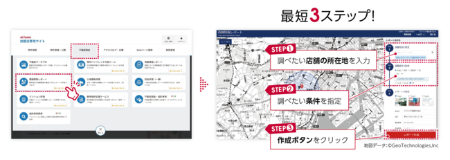 「商圏情報レポート」とは、店舗物件周辺の「街」「人」「施設」に関する情報をまとめたレポートを簡単に作成できるサービスです。商圏情報は出店を検討しているテナントにとって、店舗を選択する際に非常に重要な情報です。本サービスにより、不動産会社は接客時に住所と条件を入力するだけで、街の特性や居住者特性、競合店などの情報をまとめたレポートを出力することができます。
