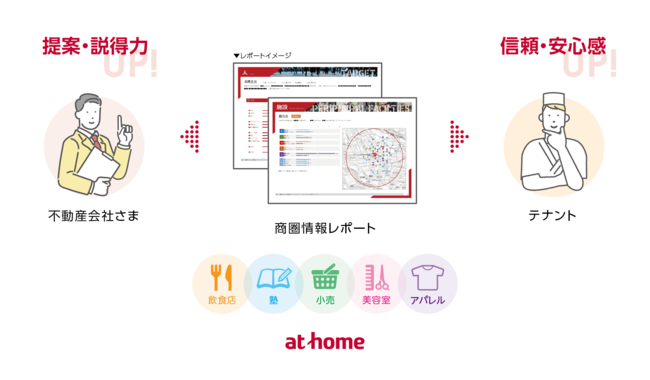 不動産情報サービスのアットホーム株式会社(本社:東京都大田区 代表取締役社長:鶴森 康史 以下、アットホーム)は、技研商事インターナショナル株式会社(名古屋本社:愛知県名古屋市、東京本社:東京都新宿区、代表取締役:小嶌 智海)との協業施策第一弾として、2022年9月28日(水)より「街」・「人」・「施設」の3分類で、“出店立地の選定・評価”の視点からエリアの特性を分かりやすくレポート化できる「商圏情報レポート」を不動産会社向けに提供開始いたします。