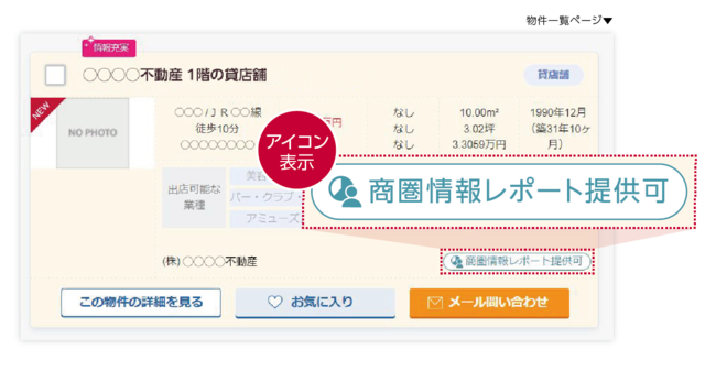 <物件一覧の商号欄に「商圏情報レポート提供可」アイコンを設置>