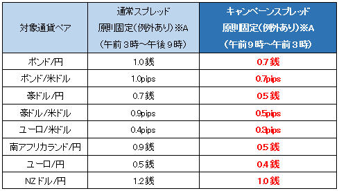 ※キャンペーンスプレッドの提示時間帯はすべて対象期間中の各営業日の午前9時~翌午前3時。同期間中の通常スプレッドは各営業日の午前3時~午前9時に提示。