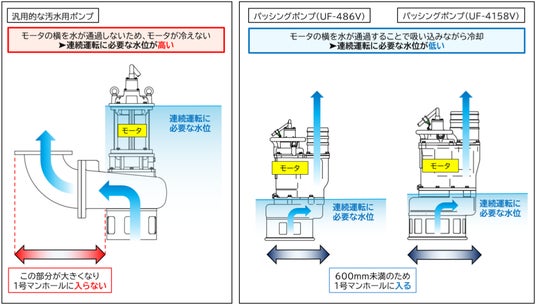 2.水位が低くても排水の流れでモータを冷却する独自の「片水路構造」により連続運転が可能