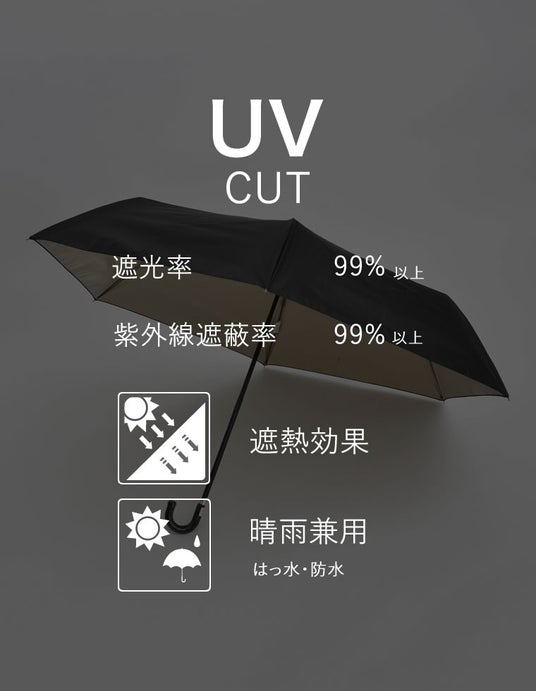 紫外線遮蔽率、遮光率ともに99%以上、内側にはPUコーティングを施し、太陽光、熱、紫外線をカットする効果があり、晴雨兼用なので夏特有の急な雨でも安心です。