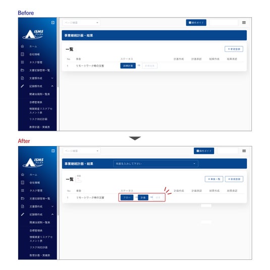 これまでクラウド型ISO管理ツール『ISMSアシスト』『9001アシスト』『14001アシスト』では、「計画」と「結果」がそれぞれ個別に管理されており、進捗状況の把握や過去データの活用に手間がかかる状況でした。