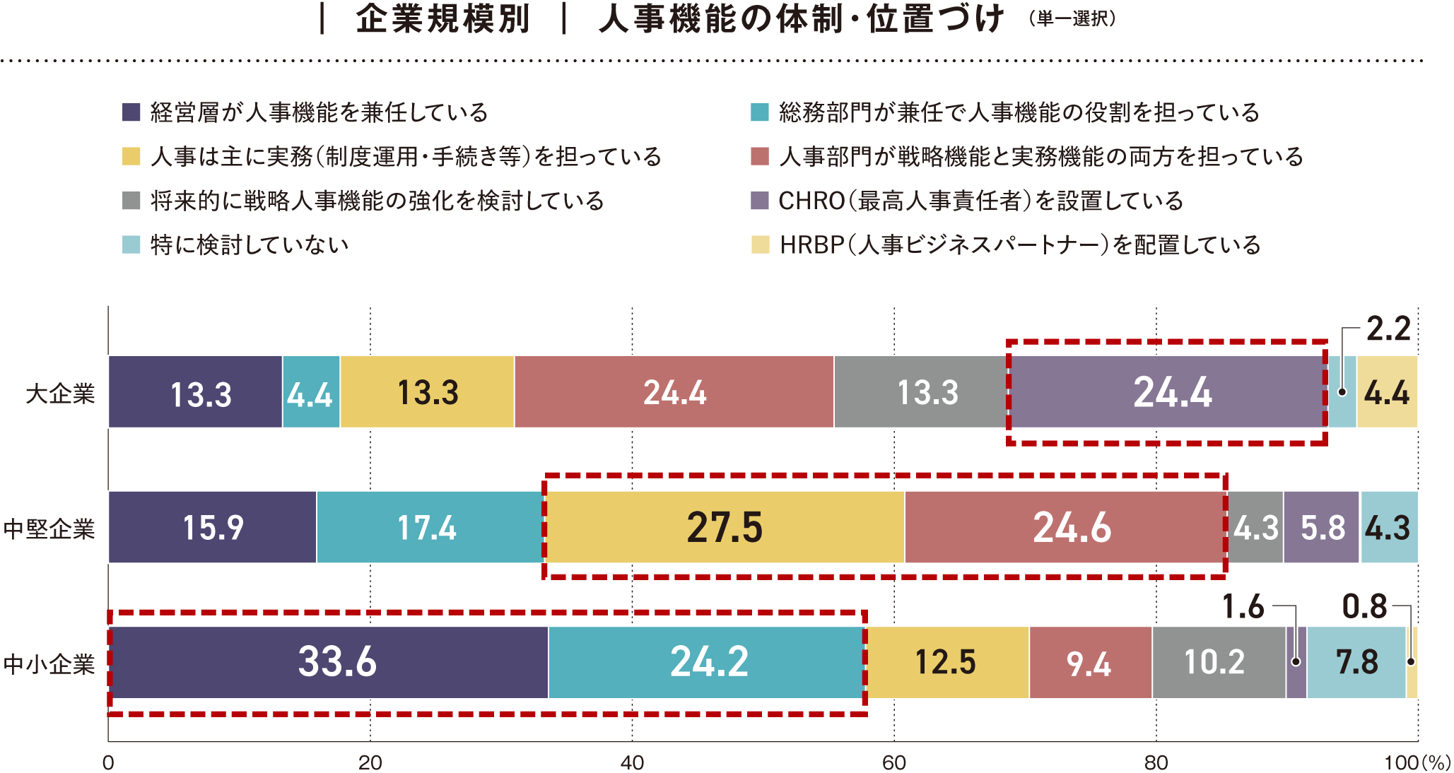 企業規模別に人事体制を分析した結果、中小企業では「経営層の兼任」(33.6%)や「総務部門による兼任」(24.2%)が目立ち、人事専任体制の整備が進んでいない状況が見られました。一方、中堅企業では、「実務中心の人事部門」(27.5%)や「戦略・実務両方を担う人事部門」(24.6%)の割合が高く、人事機能を明確に部門として確立する動きが進んでいます。大企業では、「CHROの設置」(24.4%)の割合が中小・中堅企業と比較して圧倒的に高く、戦略人事への移行が進んでいることが分かります。このように、企業規模に応じて「兼任型 → 部門型 → 戦略型」へと人事体制の成熟度が段階的に進化している構図が浮き彫りになりました。