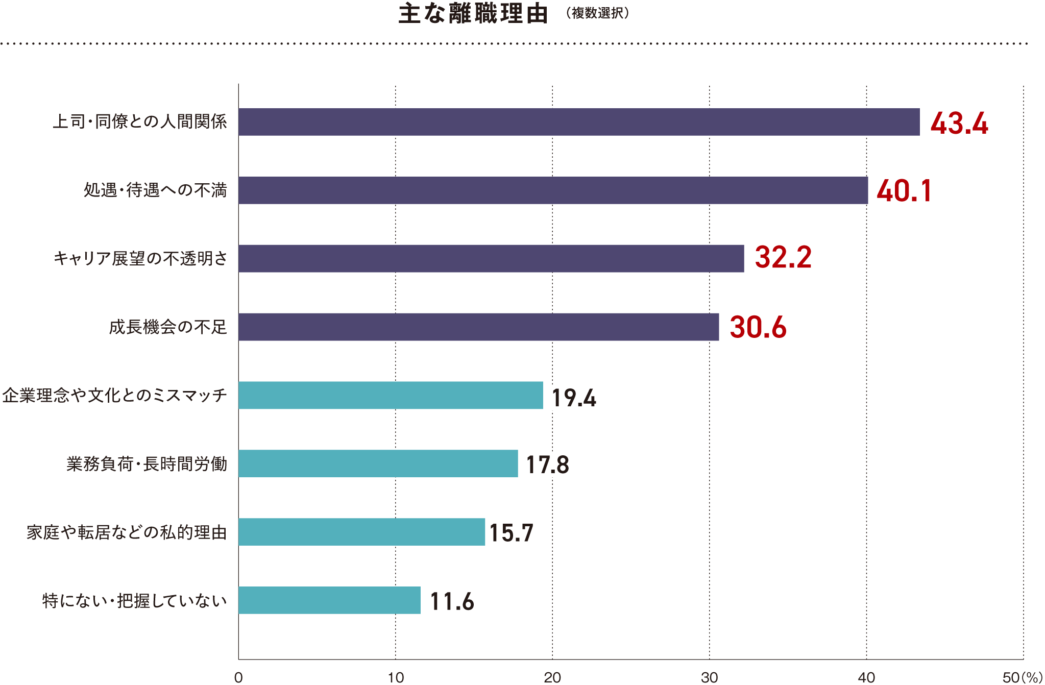 (7)離職理由の上位は「人間関係」「処遇・待遇への不満」、将来性や自己実現も重視。