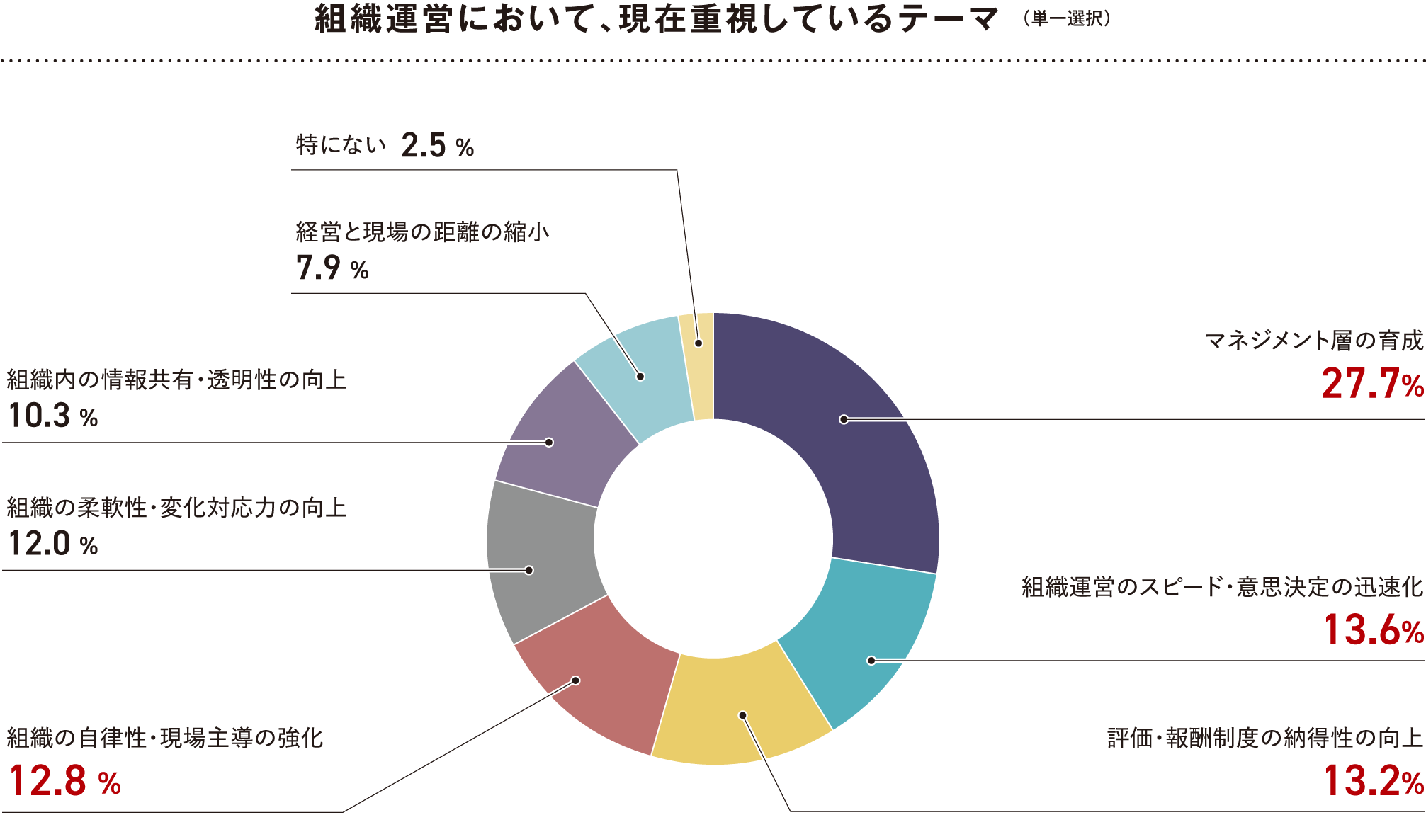 現在重視している組織運営テーマとして最も多く挙げられたのは「マネジメント層の育成」(27.7%)でした。次いで、「組織運営のスピード・意思決定の迅速化」(13.6%)、「評価・報酬制度の納得性の向上」(13.2%)、「組織の自律性・現場主義の強化」(12.8%)が続きます。各企業において、マネジメント層の強化を通じて経営基盤の再構築を目指す意識が高いことがうかがえます。