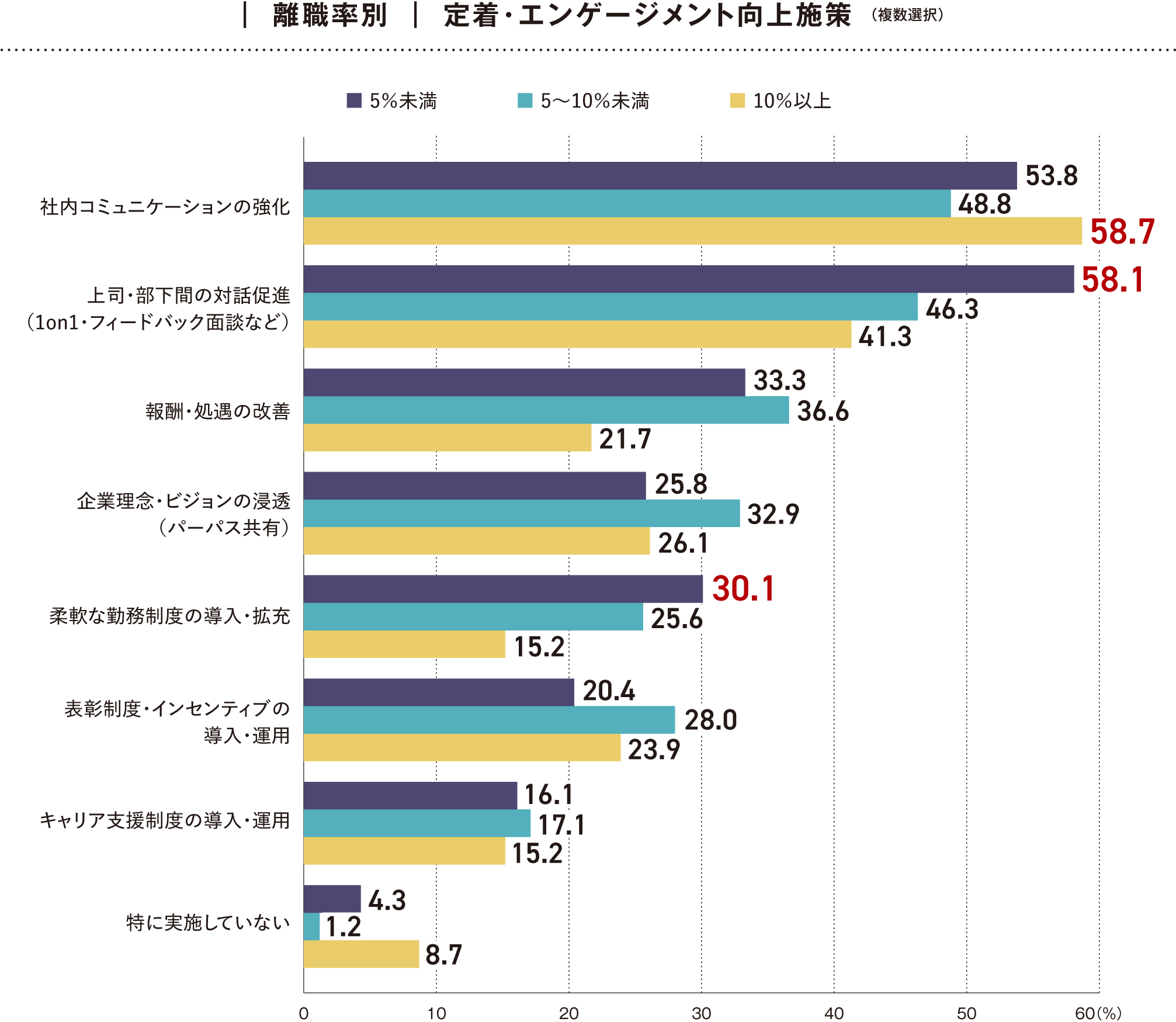 一方、離職率が10%以上の企業では「社内コミュニケーションの強化」(58.7%)に偏っており、「報酬・処遇の改善」や「柔軟な勤務制度の導入・拡充」が相対的に低い傾向が見られました。対話に加えて制度面の対応も重要なポイントとなりそうです。