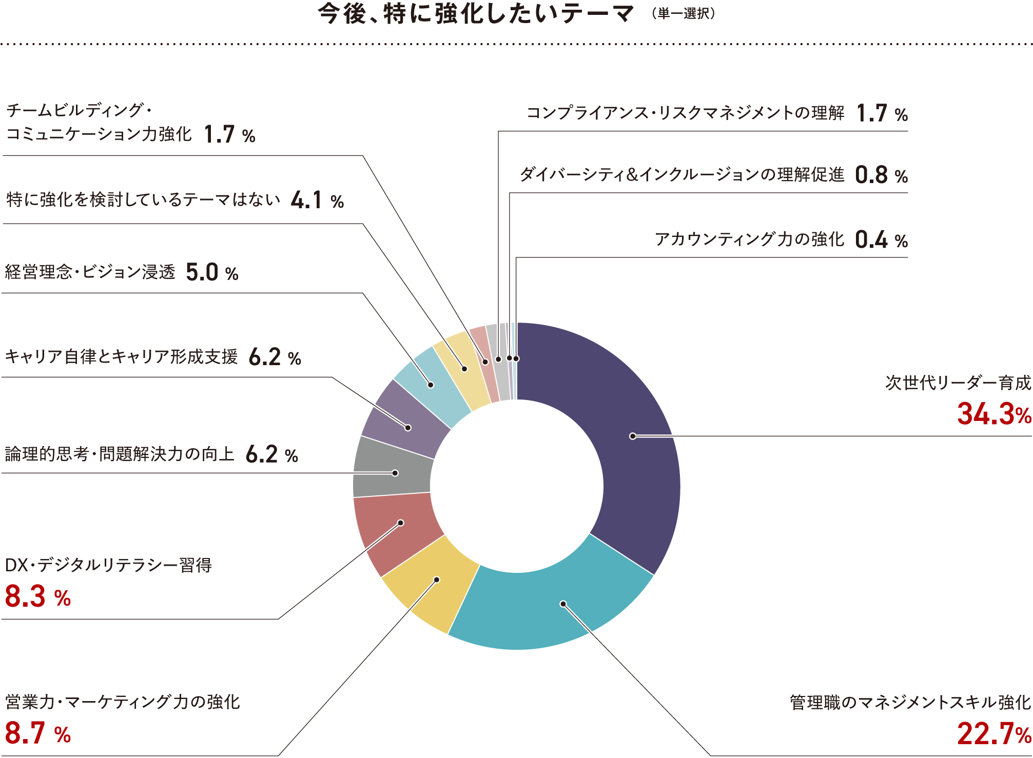 今後、特に強化したいテーマを問う設問では、「次世代リーダー育成」(34.3%)と「管理職のマネジメントスキル強化」(22.7%)が上位を占めました。実務経験を積んだ層に対して、マネジメント力や将来の組織運営を担う力を高める意識が強まっていることが分かります。加えて、「営業力・マーケティング力の強化」(8.7%)や「DX・デジタルリテラシー習得」(8.3%)も一定の関心を集めていることから、経営と現場の両面で推進力を担う人材づくりが今後の鍵となりそうです。