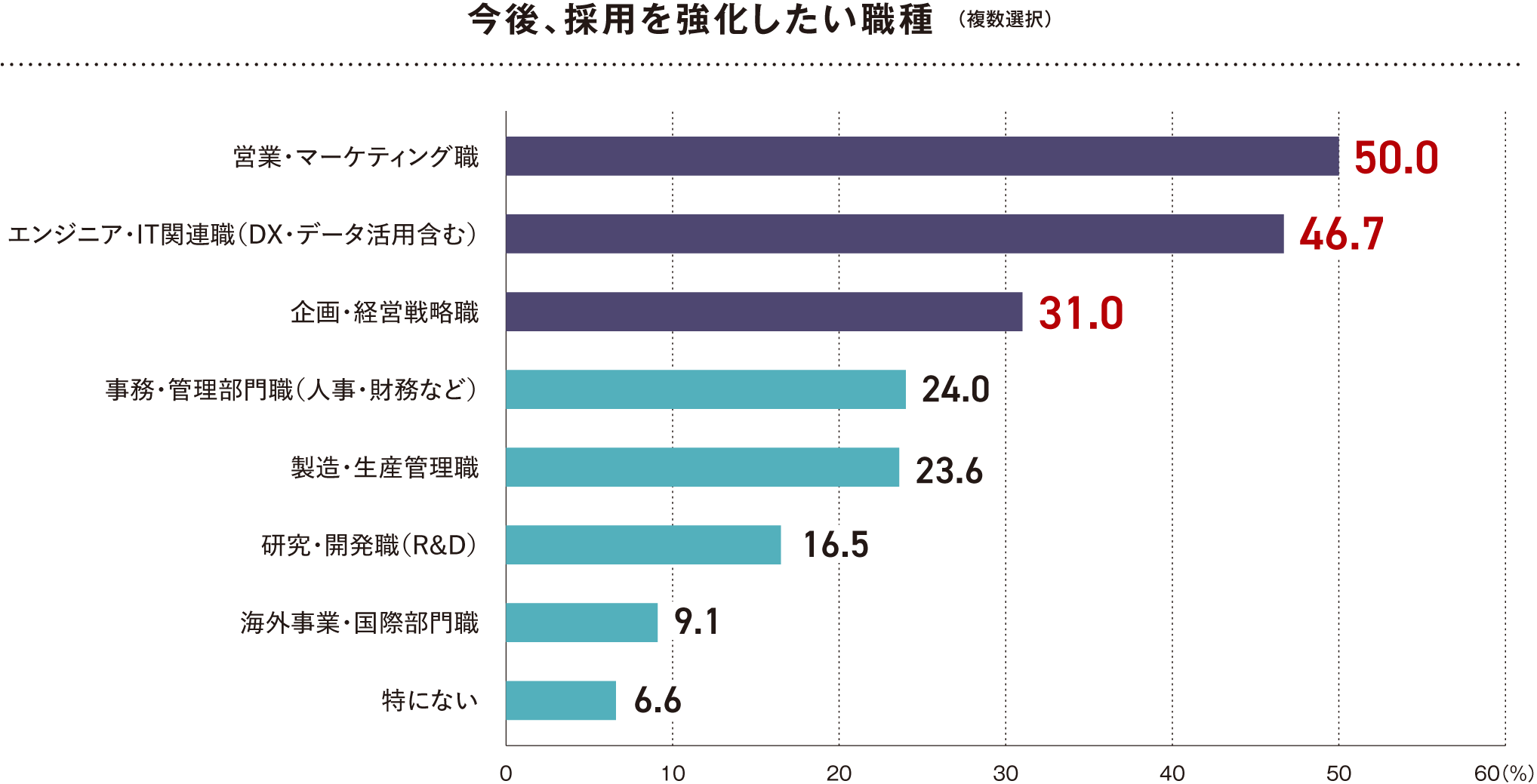今後採用を強化したい職種としては、「営業・マーケティング職」(50.0%)が最多となり、次いで「エンジニア・IT関連職(DX・データ活用含む)」(46.7%)が高い割合を示しました。また、「企画・経営戦略職」(31.0%)も3割を超えております。一方、「事務・管理部門職」や「製造・生産管理職」は2割台にとどまっていることから、フロント機能や成長ドライバーとなる職種への重点採用が進められていることがうかがえます。
