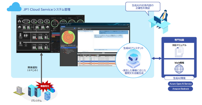 株式会社日立製作所(以下、日立)は、統合システム運用管理「JP1」のSaaS版である「JP1 Cloud Service」において、生成AIを用いた運用効率化・自動化に関する実証実験を2月1日から行います。具体的には、生成AIを対話形式で容易に利用できる生成AIアシスタント(開発中の機能)を用いて、運用オペレーターがシステム監視中に発生する各種イベント(メッセージ)への対応を効率化することを想定し、生成AIの応答内容の正確性などを検証します。日立は本実証を第一弾とし、生成AIを用いた運用効率化・自動化の適用範囲を拡大し、IT部門の変革に貢献することをめざします。