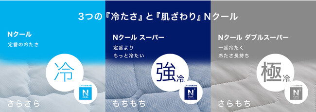 「Nクール寝具」は定番の冷たさ「Nクール」シリーズ、もっと冷たい「Nクールスーパー」シリーズ、一番冷たく冷たさ長続きの「NクールWスーパー」シリーズの3種類。それぞれの肌ざわりは「Nクール」はさらさら、「スーパー」はもちもち、「Wスーパー」はさらさらもちもちと、お好みでお選びいただけます。ぜひ店頭で触って、違いを実感してみてください。
