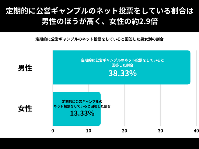 定期的に公営ギャンブルのネット投票をしていると回答した割合を男女別でみてみますと、男性が38.33%、女性が13.33%という結果になりました。