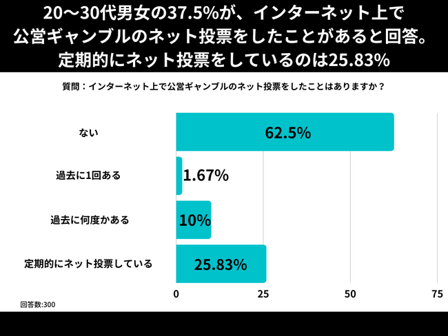 20~30代男女を対象とした「インターネット上で公営ギャンブルのネット投票をしたことはありますか?」というアンケートで最も多かった回答は「ない」で62.5%でした。