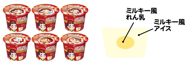 昨年発売された「不二家ミルキーカップ」よりもアイスの空気含有量を減らすことで、よりなめらかで濃密な味わいに仕立てました。また、北海道産生クリームとミルキー風れん乳を使用したアイスに、新たに北海道産牛乳を配合することで、優しい「ミルキー」の風味を再現しました。アイスの真ん中にもミルキー風れん乳が入っており、濃厚な味わいをお楽しみいただけます。