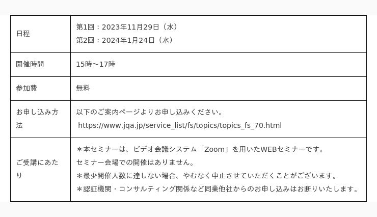 一般財団法人日本品質保証機構(本部:東京都千代田区、理事長:石井 裕晶)は、2022年度よりサービスロボットに関連する無料WEBセミナーを開催し、多くの方々にご受講いただいております。今年度は、そのなかでも特に皆さまの関心が高く、大変ご好評をいただきました「リスクアセスメント」と、リスク軽減策の一つとして各種ロボットやFA機器で適用されている「機能安全」に焦点をあてたセミナーを開催いたします。